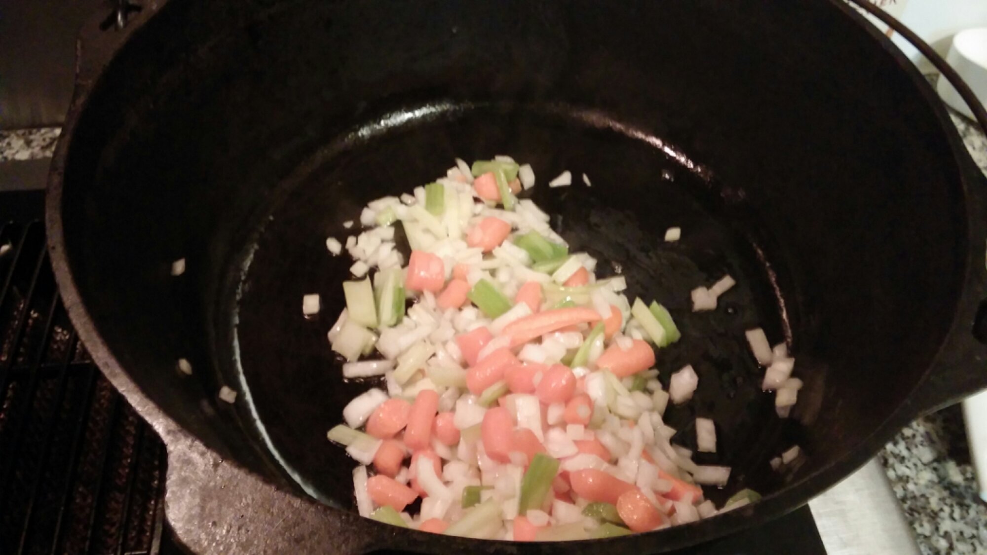 Take all of the veggies besides the potatoes and olives. Throw them all in a big pot. Let them do their thing for about 5-8 minutes. No need to worry about how well their cooked just yet because they have the rest of the time in the stew to marinate.